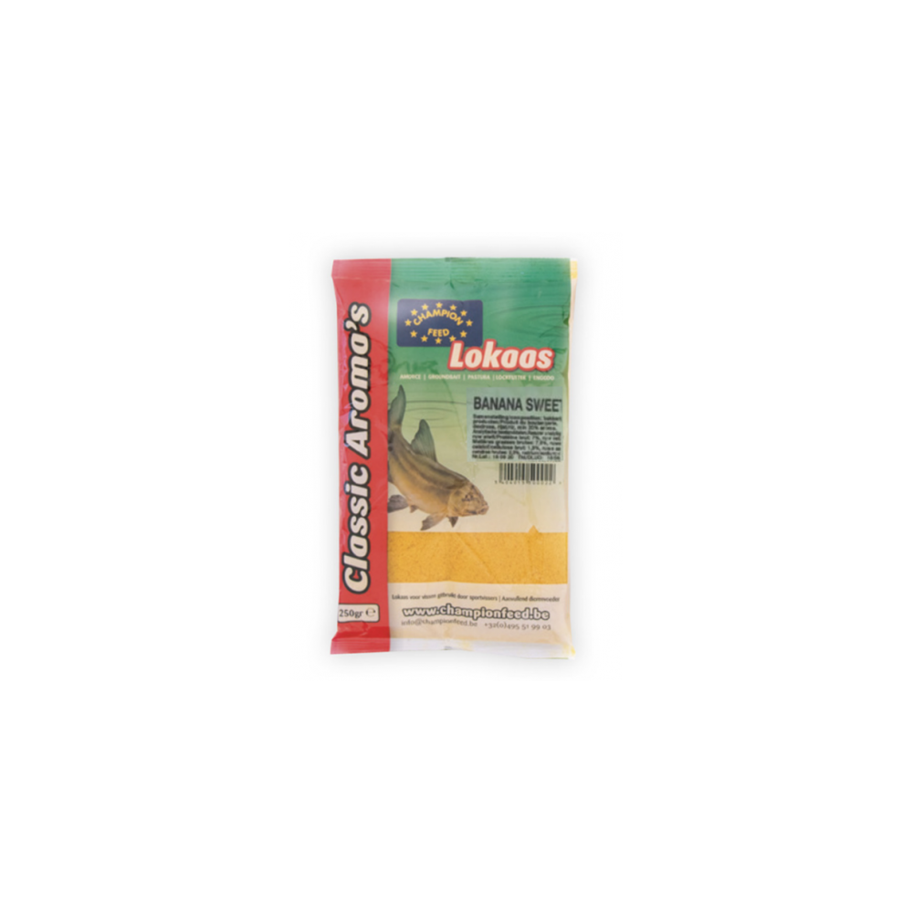 Champion Feed Classic Aroma Banana Sweet, dit aroma Banana Sweet werd speciaal ontwikkeld om gemengd te worden met lokaas in warmere wateren en voor de grotere vissen. Verpakt in zakjes 250g Maximum 2 soeplepels per kilogram droog lokaas.
