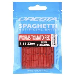 Cresta Spaghetti Worms Tomato Red, is een drijvend kunstaas van hoge kwaliteit. Wanneer het op de haak geplaatst wordt, ontstaat een zwevend of zeer langzaam zinkende aaspresentatie. Samen met de opvallende kleuren wordt deze hier door enorm attractief voor vele vissoorten. Spaghetti Worms kunnen direct op de haak gebruikt worden in één of meerdere kleuren tegelijk. Maar kan zeker ook gebruikt worden in combinatie met levend aas, zoals maden en wormen dit geeft zeker extra vangkracht. Dankzij de 3 verschillende formaten in de verpakking kunnen de Spaghetti Worms gecombineerd worden met vele haaksoorten en maten.
