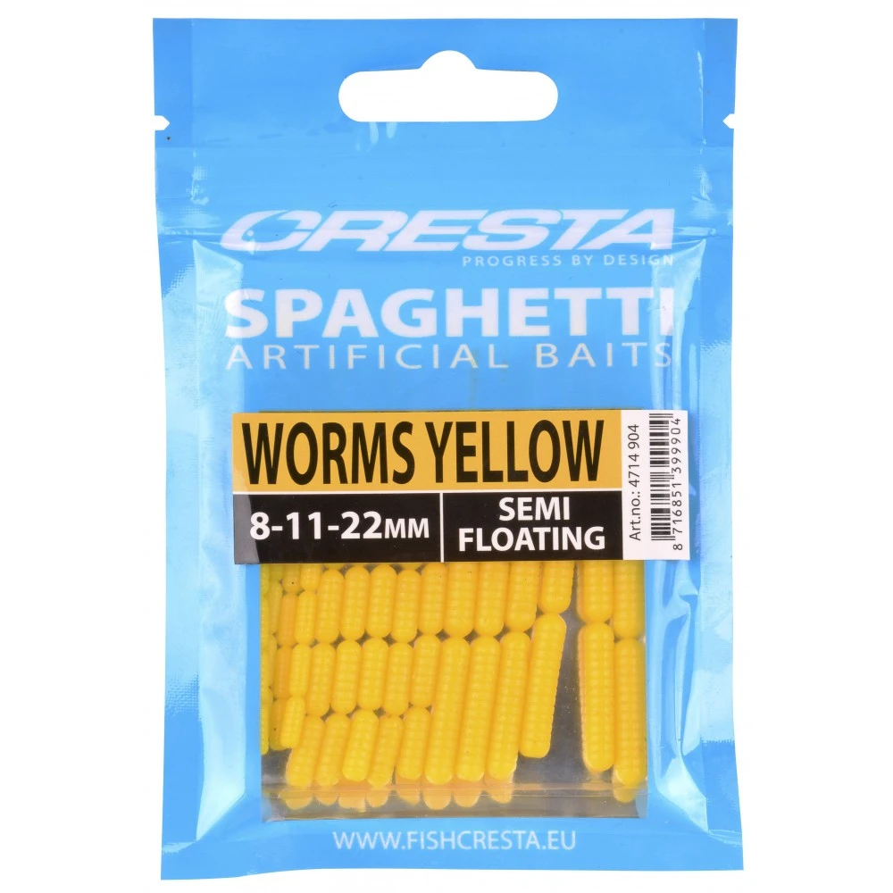 Cresta Spaghetti Worms Yellow, is een drijvend kunstaas van hoge kwaliteit. Wanneer het op de haak geplaatst wordt, ontstaat een zwevend of zeer langzaam zinkende aaspresentatie. Samen met de opvallende kleuren wordt deze hier door enorm attractief voor vele vissoorten. Spaghetti Worms kunnen direct op de haak gebruikt worden in één of meerdere kleuren tegelijk. Maar kan zeker ook gebruikt worden in combinatie met levend aas, zoals maden en wormen dit geeft zeker extra vangkracht. Dankzij de 3 verschillende formaten in de verpakking kunnen de Spaghetti Worms gecombineerd worden met vele haaksoorten en maten.