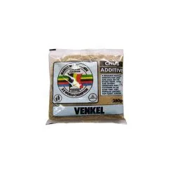 Marcel Van Den Eynde Additieven Venkel, bij veel recepten niet weg te denken. Verreweg de meeste vissers zouden niet eens op weg gaan zonder één of ander additief te hebben toegevoegd aan het lokaas dat ze hebben gekozen. De reden hier voor is erg simpel, men gelooft dat de gekozen toevoeging ervoor zorgt dat nog meer in de buurt rondzwemmende vissen naar de gekozen visplaats worden gelokt. Het geloof hierin vergroot het vertrouwen waarmee men het lokaas gebruikt en dit vertrouwen is het magische woord in onze sport. Van Den Eynde poeder additieven zijn de meest gebruikte toevoegingen aan lokaas. Ze zijn in allerlei soorten en smaken verkrijgbaar. De vaste stelregel is dat de inhoud van een zakje ruim voldoende is voor 4 tot 5 kilo droog lokaas, maar zoals gezegd is dit slechts een indicatie. De beste manier om poeder additieven te gebruiken is om of de additieven op te lossen in het water waarmee U het lokaas bevochtigt of om de droge additieven simpelweg te mengen met het droge lokaas voordat U dit gaat bevochtigen.