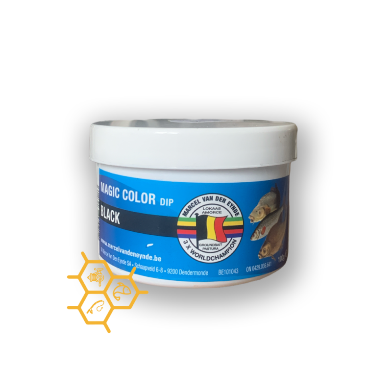 Marcel Van Den Eynde Magic Colour Zwart, Magic colour zijn geconcentreerde kleurstoffen waar mee men het lokaas perfect kan aanpassen aan de precieze visomstandigheden. Bovendien vormen zij de ideale wolkvormer. Perfect bij het vissen op alvers en andere kleine vissen. Ook ideaal voor het vissen “op half water”.