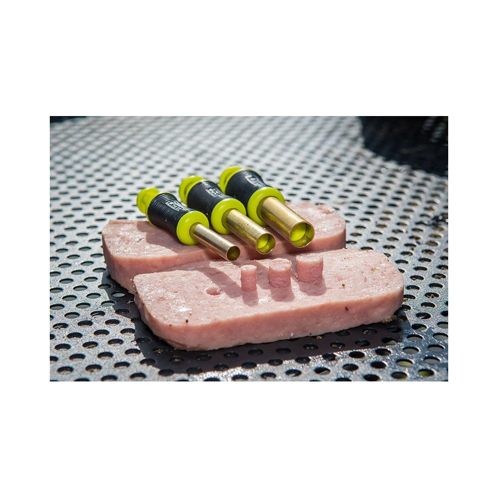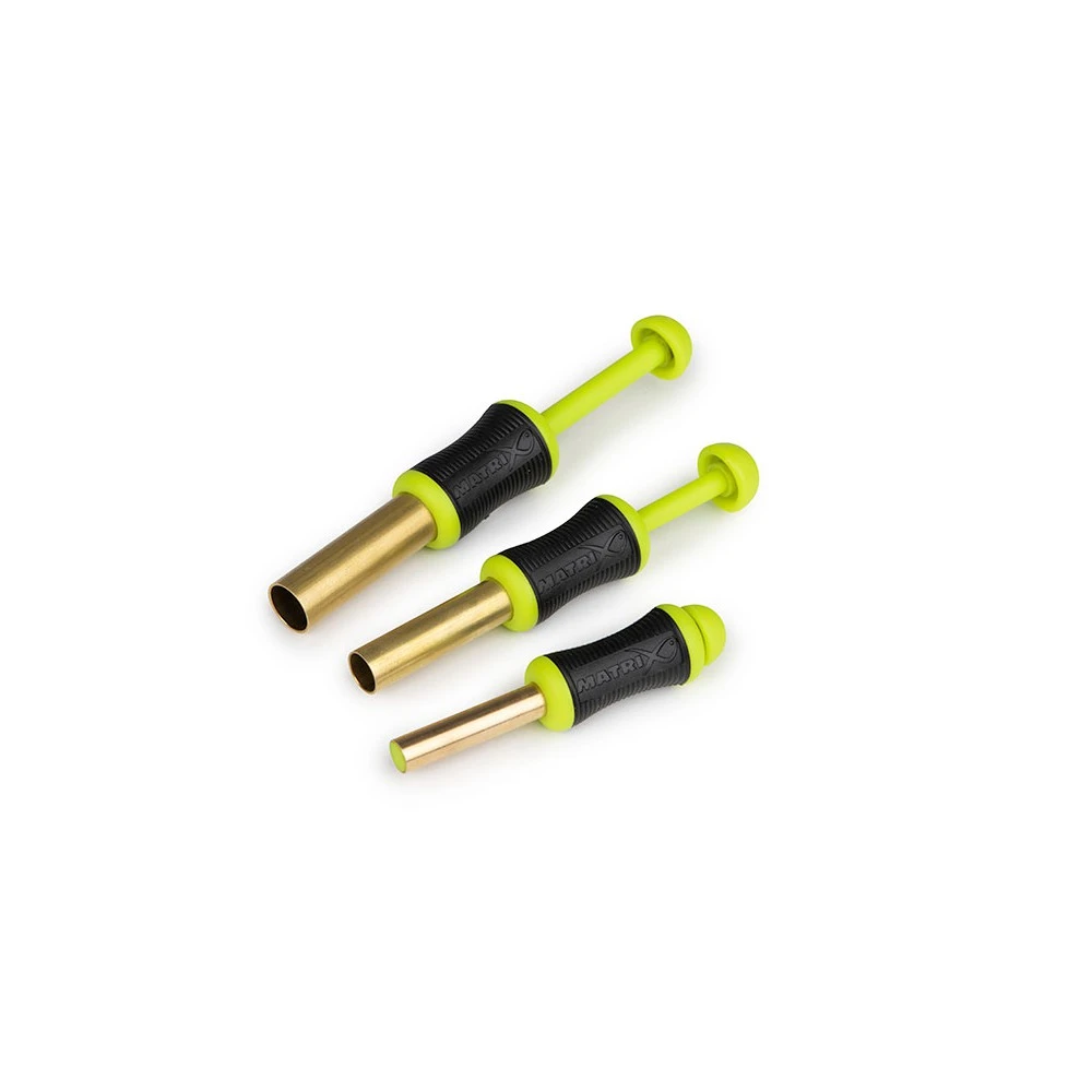 Matrix Compression Punch Set, dit is een set van 3 punches: 6 mm, 8 mm en 10 mm. Perfect voor punchen van zacht aas als boterhamworst en brood. Heeft een messing uitvoering voor duurzaamheid met een easy rubberen grip. Plunger voor gemakkelijk vrijkomen van haakaas.