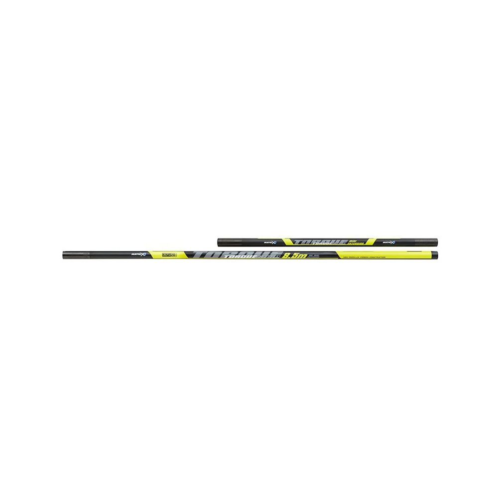 Matrix TORQUE Carp 8.5 Meter Pole Package, is inclusief top 2 kit & strike sectie, 20+ Elastiek beoordeling, delen van ultra duurzaam kruislings gelaagd carbon, glide taped afwerking op alle delen (gekleurd laatste deel), extra grote keramische gleuf voor puller (voor extra dik elastiek), top kits met grote opening (afzagen is niet nodig), 8,5m inclusief mini strike sectie, geleverd in duurzaam foedraal, 5 delen + strike sectie, Gewicht 490gr (690gr inclusief strike sectie).