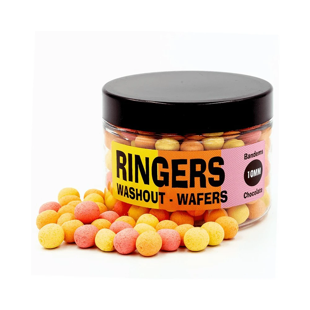 Ringers Washout Wafter Bandems 10 mm, is een semi drijvende dumbell met een opvallende kleur. Deze gekleurde en met een chocolade smaak geflavourde Dumbell zweeft op het gewicht van de haak net boven de bodem. Deze Ringers Wafters Bandems – Washout zijn ontwikkeld voor de commerciële visserij op karper en maar ook uitermate geschikt voor brasem en zeelt.